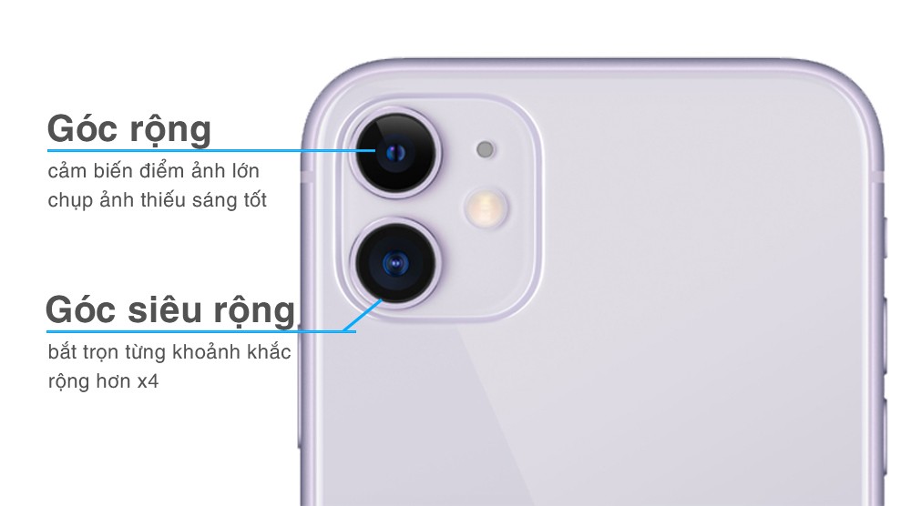 Giống như iPhone X, iPhone Xs hay iPhone Xs Max camera iPhone 11 128GB cũ vẫn sở hữu hệ thống camera kép. Tuy nhiên thiết kế có phần thay đổi khi Apple đã đặt nó trong một khối hình vuông khá lớn cùng đen flash tạo ra sự khác biệt so với thế hệ tiền nhiệm. Hệ thống camera có độ phân giải 12 MP gồm 1 ống kính góc rộng và 1 ống kính góc siêu rộng.