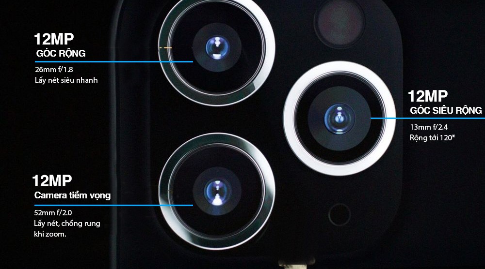 Camera iPhone 11 Pro Max 64GB cũ là một trong những điểm nhấn ấn tượng giúp điện thoại trở nên thu hút hơn. Bộ đôi iPhone 11 Pro và iPhone 11 Pro Max là những điện thoại đầu tiên được tích hợp đến 3 camera ở mặt sau. Việc bổ sung thêm camera góc siêu rộng mang đến khả năng chụp ảnh chuyên nghiệp hơn.