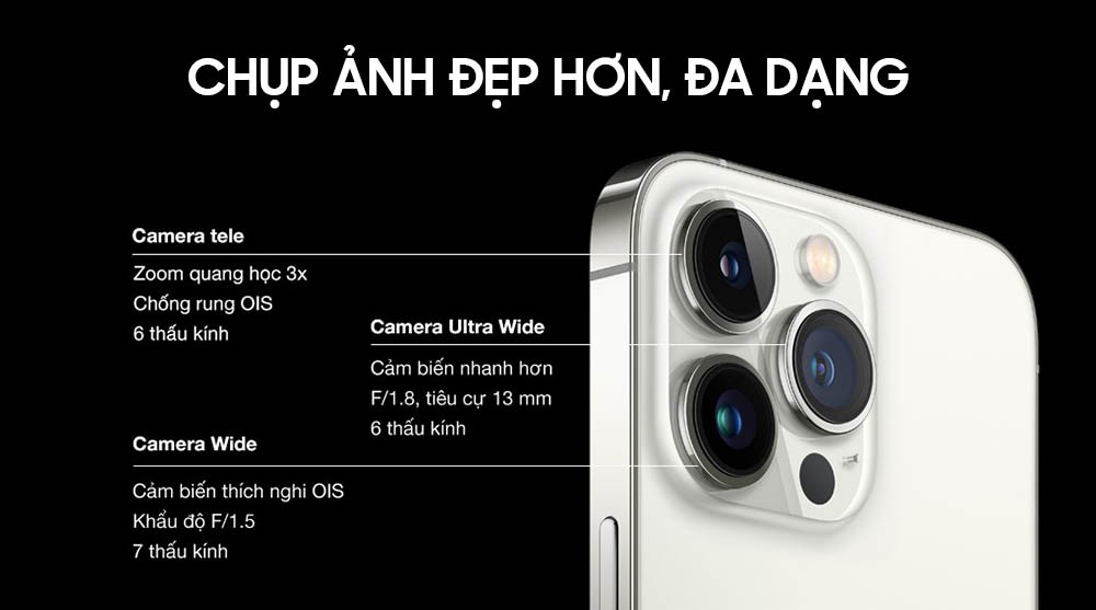 Hệ thống camera iPhone 13 Pro Max 128GB VN/A nhận được sự nâng cấp toàn diện, chắc chắn sẽ mang đến trải nghiệm chụp ảnh cũng như quay phim trở nên chuyên nghiệp hơn. Điện thoại vẫn được trang bị 3 ống kính cùng cảm biến LiDAR gồm: