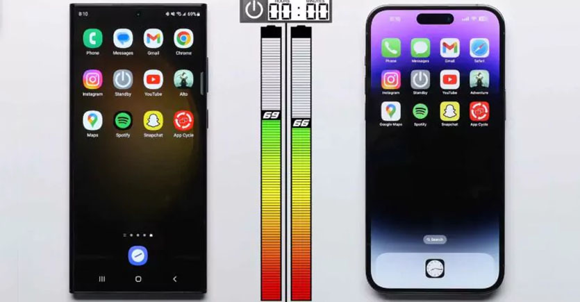 Các ứng dụng mạng xã hội như Snapchat và Facebook có tác động lớn nhất đến Galaxy S23 Ultra. Kết thúc bài kiểm tra, iPhone 14 Pro Max có thể kéo dài với thời gian 27 giờ 44 phút, trong khi Samsung S23 Ultra là 27 giờ 6 phút. Cả hai điện thoại thông minh đều tồn tại cùng một khoảng thời gian trong bài kiểm tra ở chế độ chờ là 16 giờ, vì vậy những kết quả này là minh chứng cho việc chuyển sang sử dụng chip và linh kiện tiết kiệm điện năng hơn có thể thay đổi trải nghiệm tổng thể.